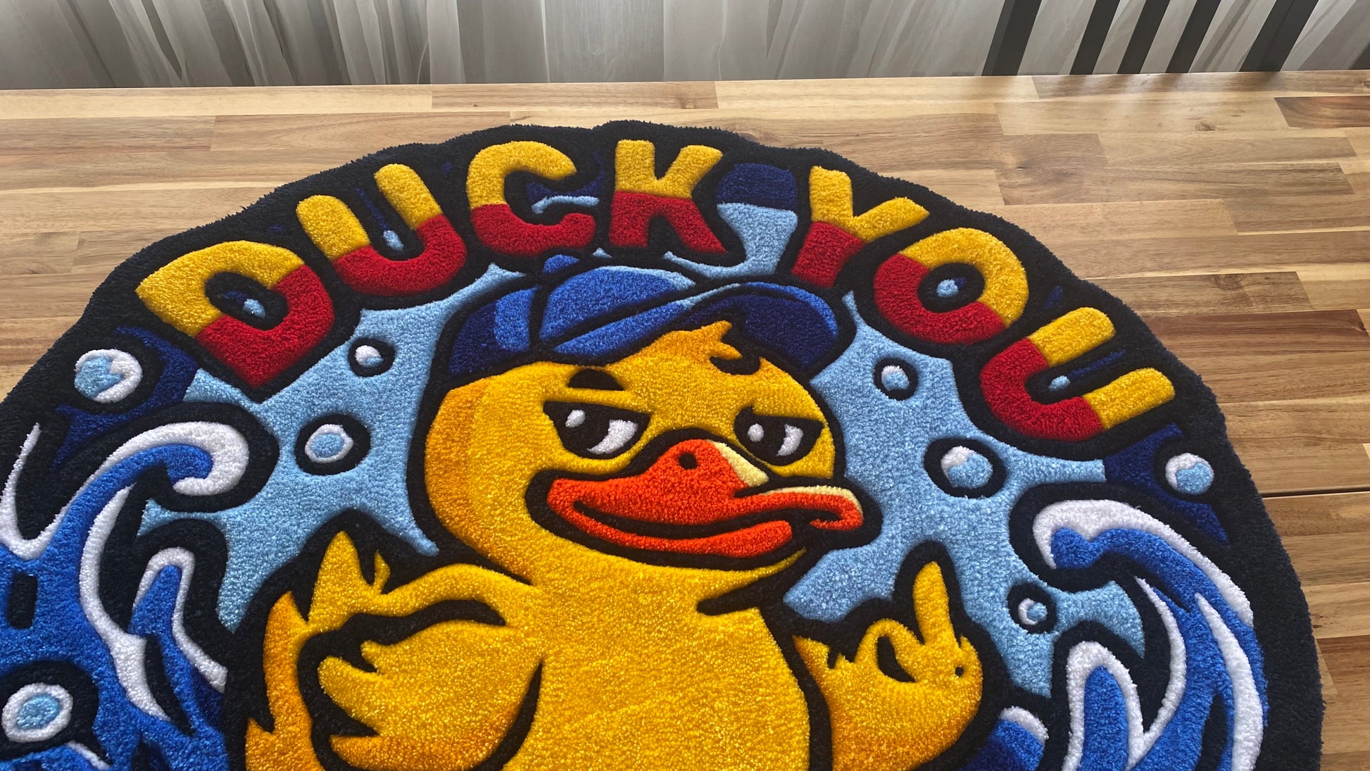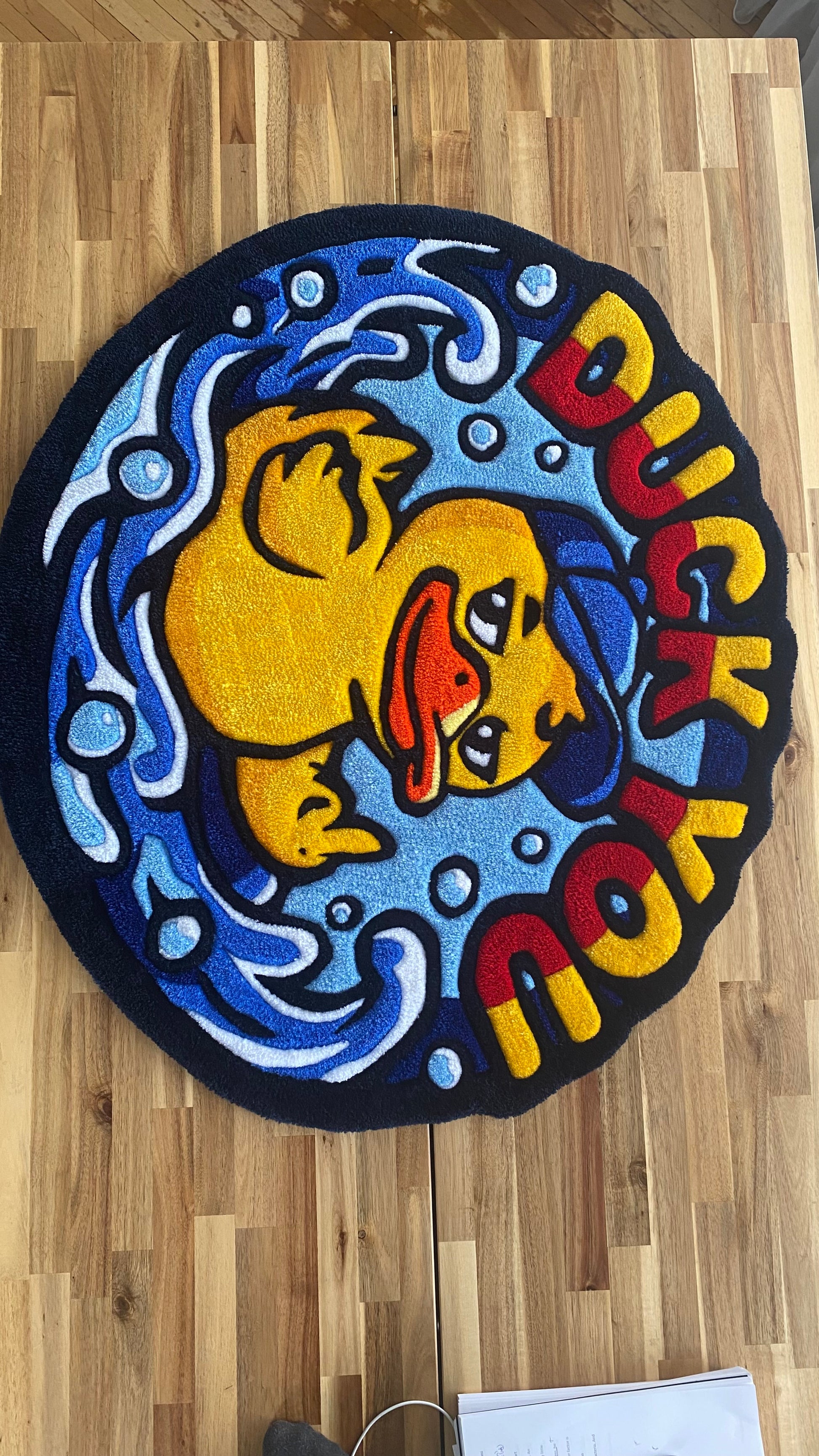 El yapımı tufting tekniğiyle özenle hazırlanmış, canlı renklerle bezeli elips şeklinde ördek desenli halı. Sarı, mavi, kırmızı ve siyah tonlarının uyumlu kombinasyonuyla evinize neşe katacak bu eşsiz parça, hem dekoratif hem de fonksiyonel.