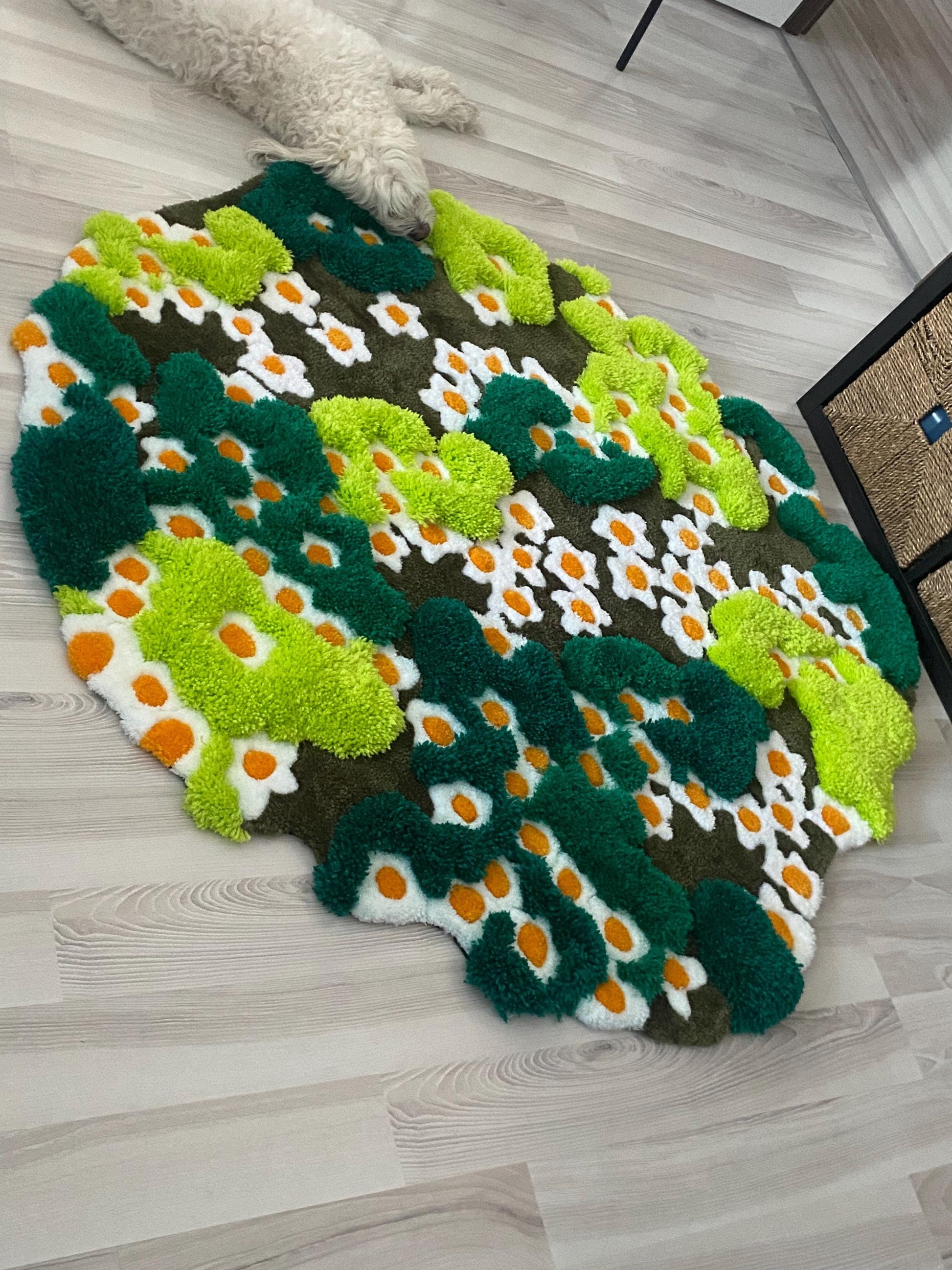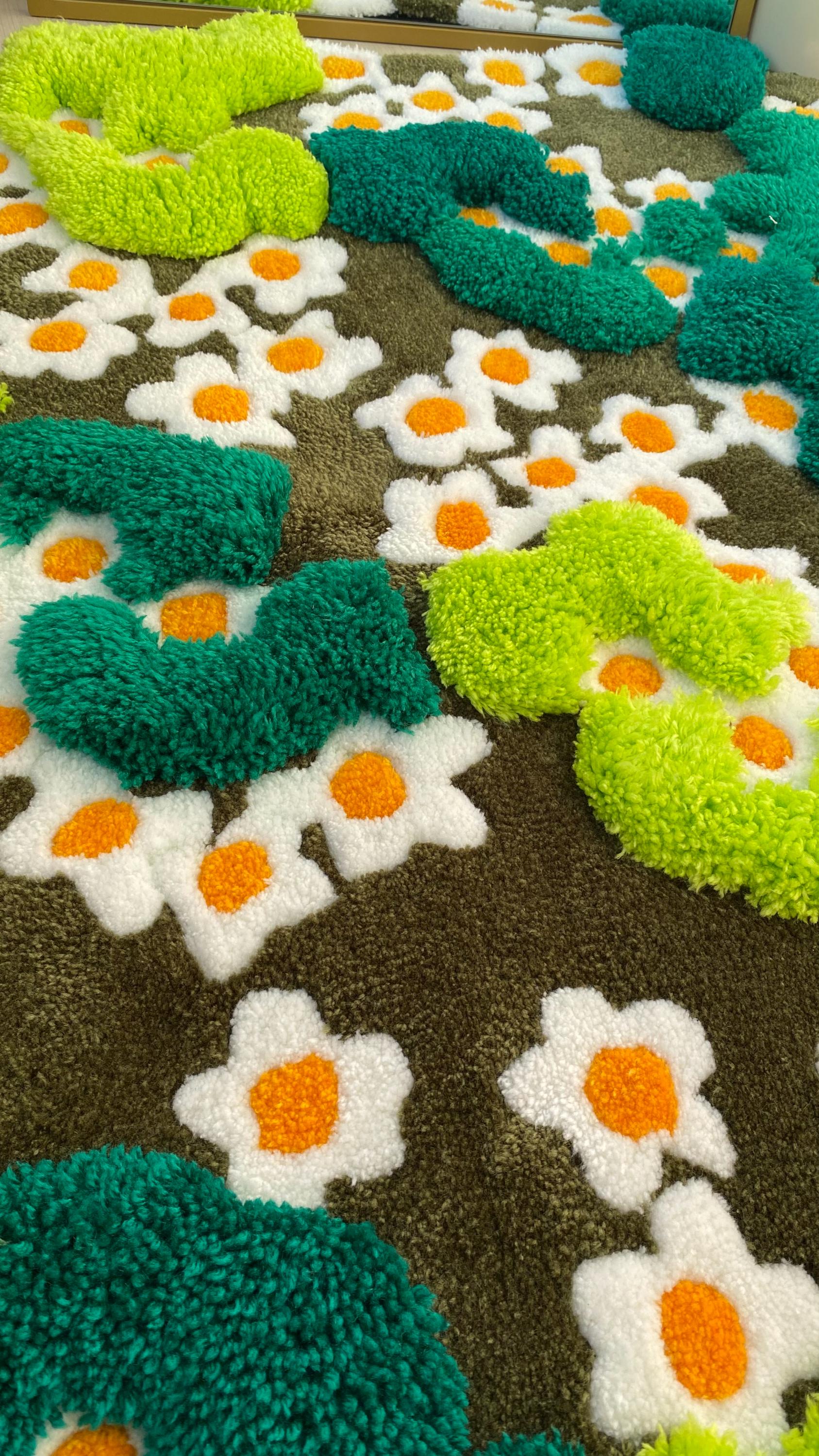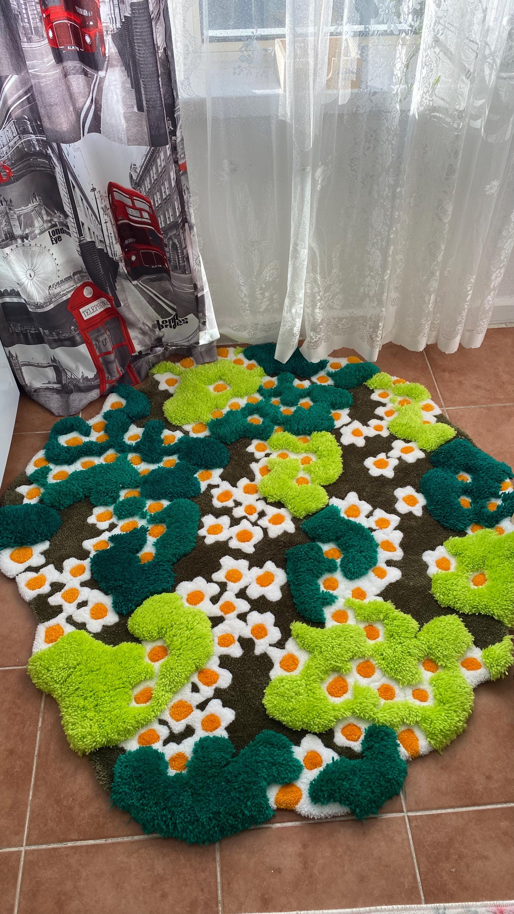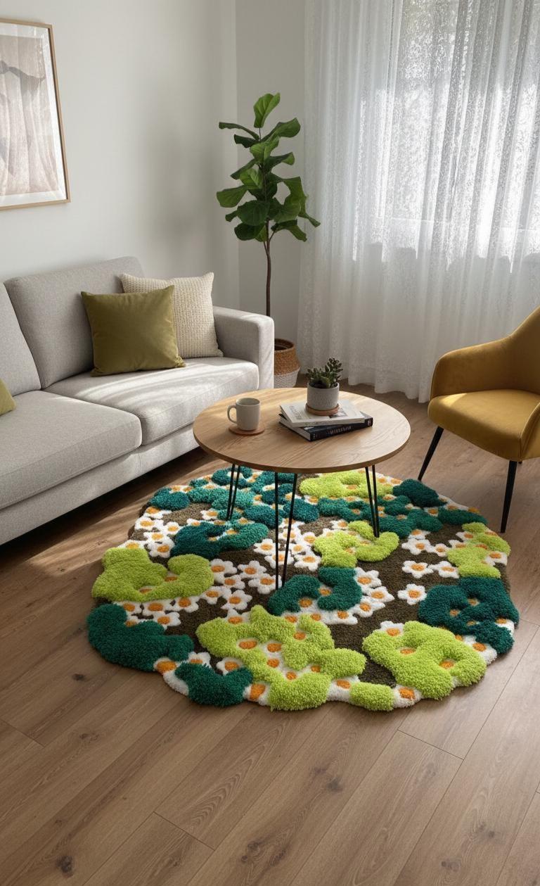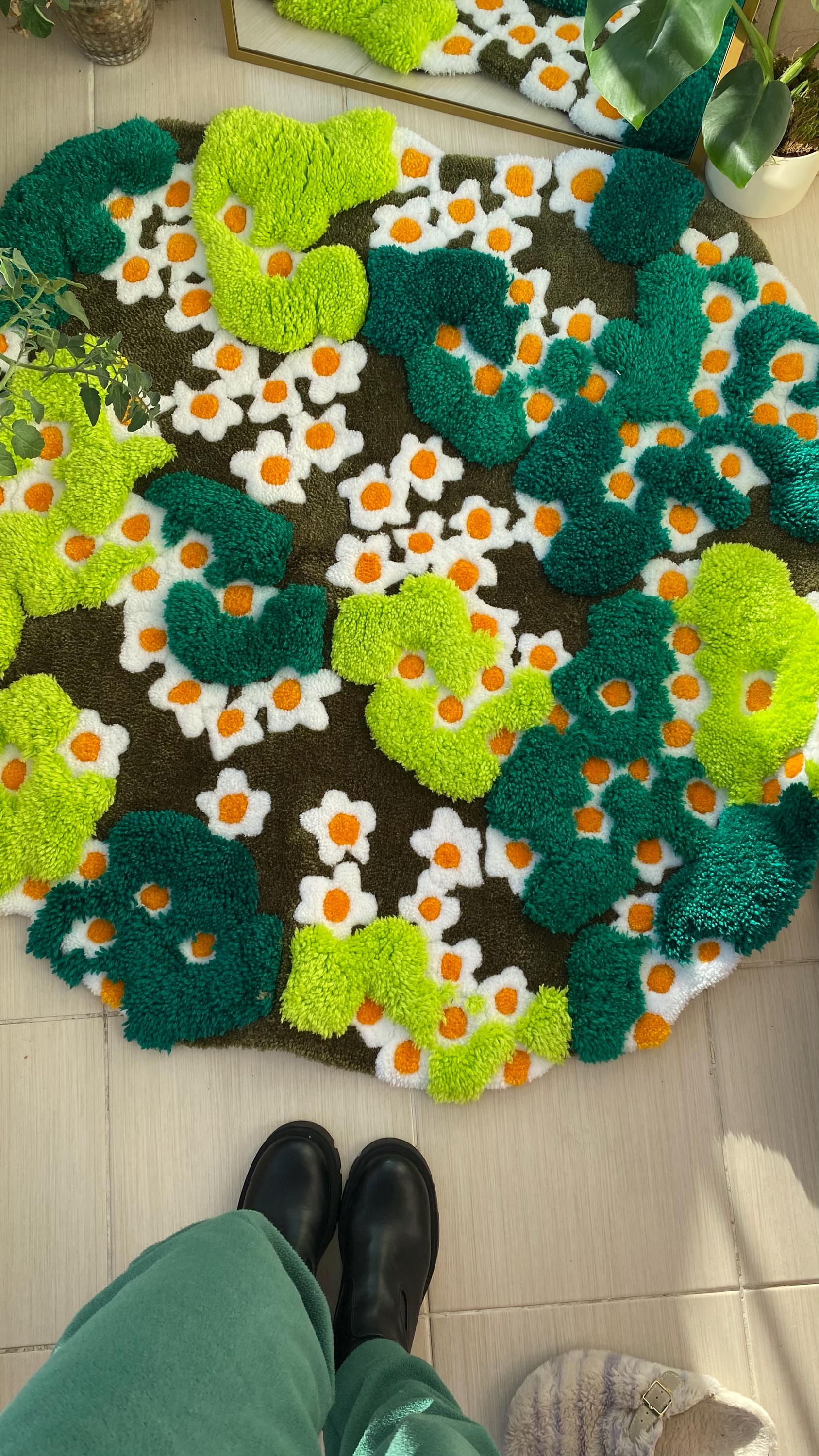 Yeşil yosun ve renkli çiçeklerle süslenmiş bu muhteşem 3D el yapımı tufting halı, doğal bir manzarayı evinize taşır. Kabarık dokusu ve canlı renkleriyle hem duvar sanatı hem de zemin dekorasyonu olarak kullanılabilen bu benzersiz orman temalı halı, cottagecore ve doğa severler için mükemmel!