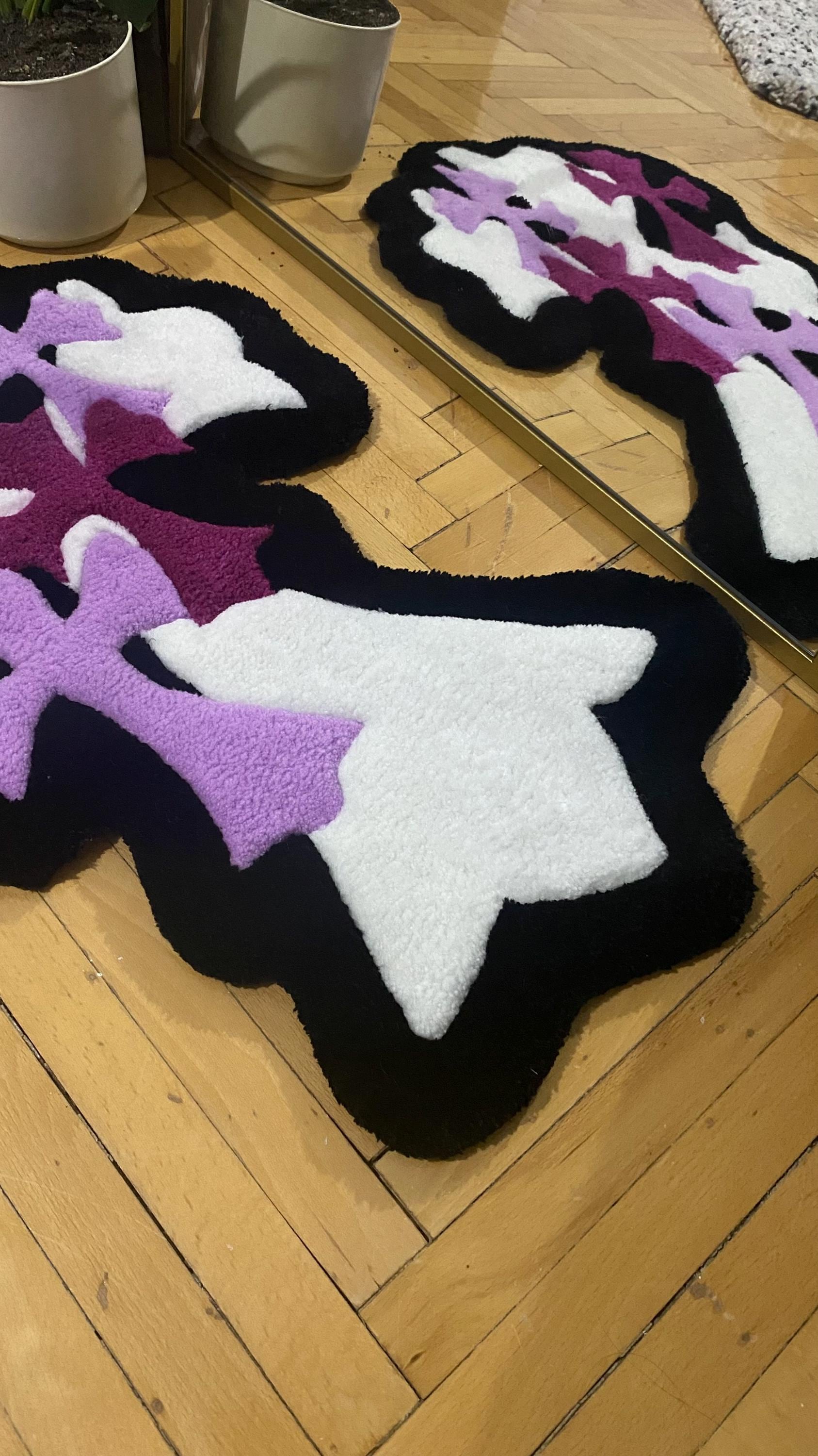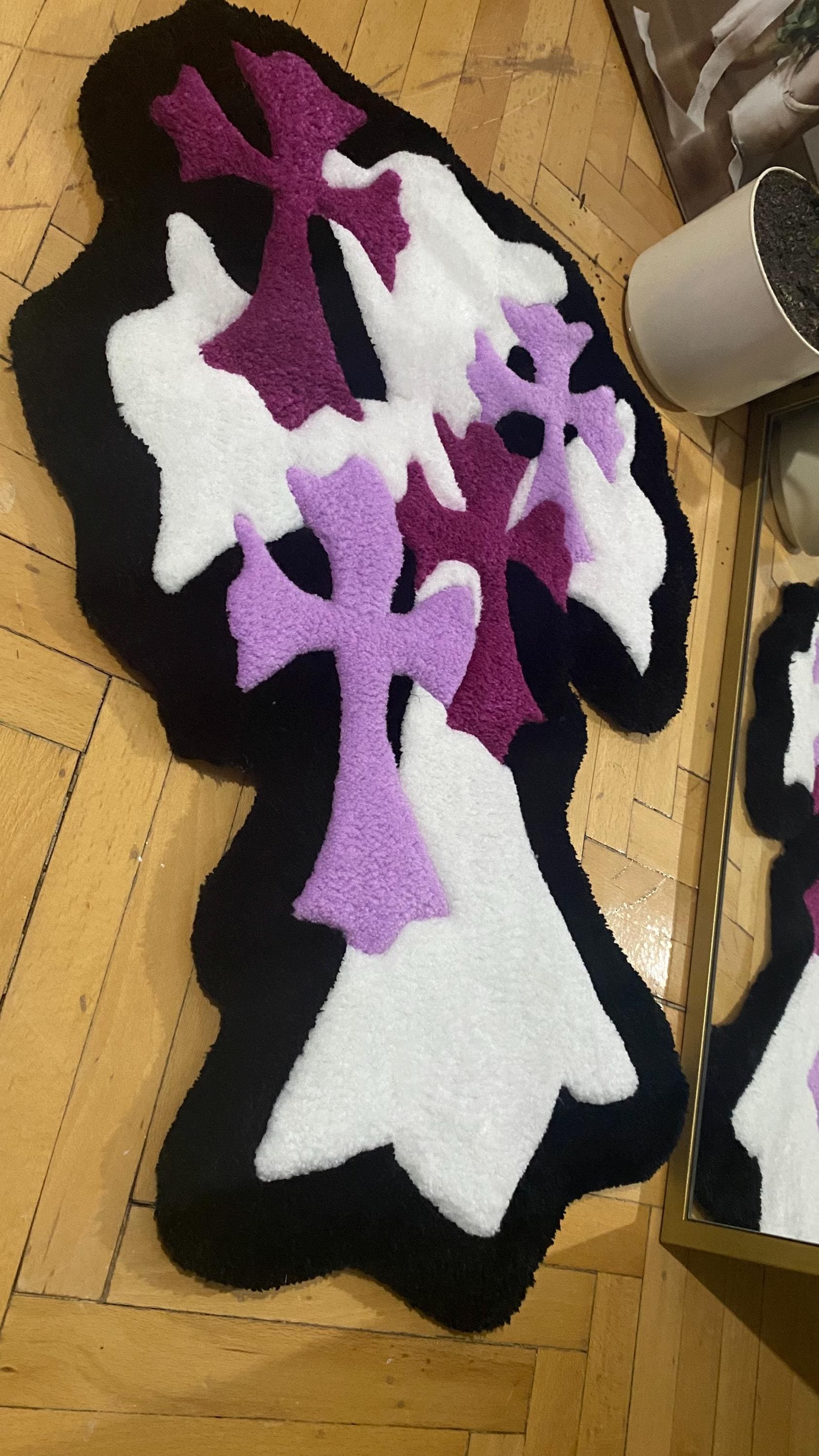 71x49 cm boyutlarında, mor, lila ve beyaz tonlarında haç tasarımıyla hazırlanmış bu el yapımı tufting halı, gotik ve alternatif dekorasyon tutkunları için mükemmel bir duvar sanatı parçası. Cesur tasarımı ve yumuşak peluş dokusuyla hem görsel hem de dokunsal bir deneyim sunar.