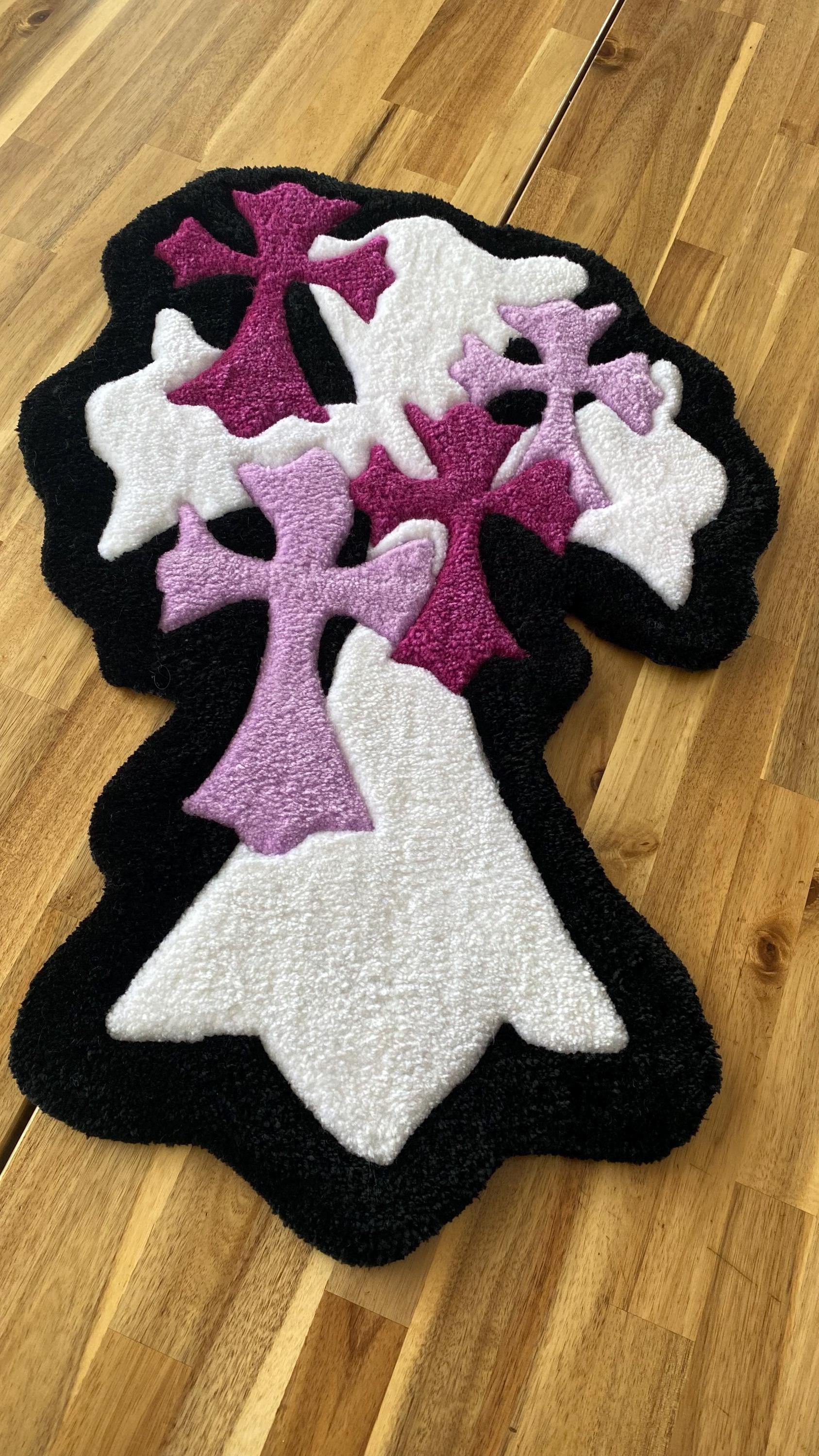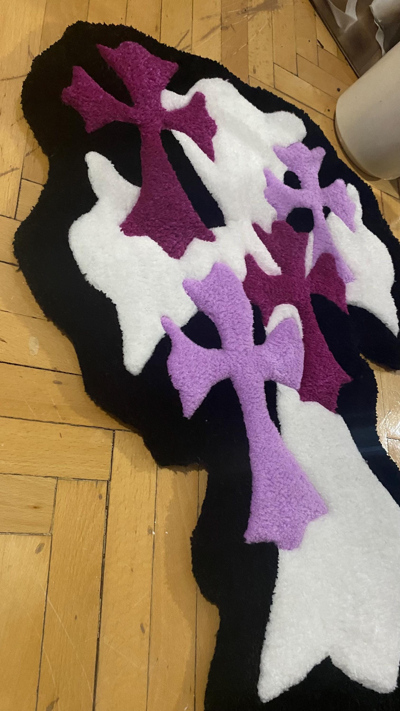 Gotik Haç Halı - 71x49cm Mor Beyaz El Yapımı Tufting Duvar Sanatı