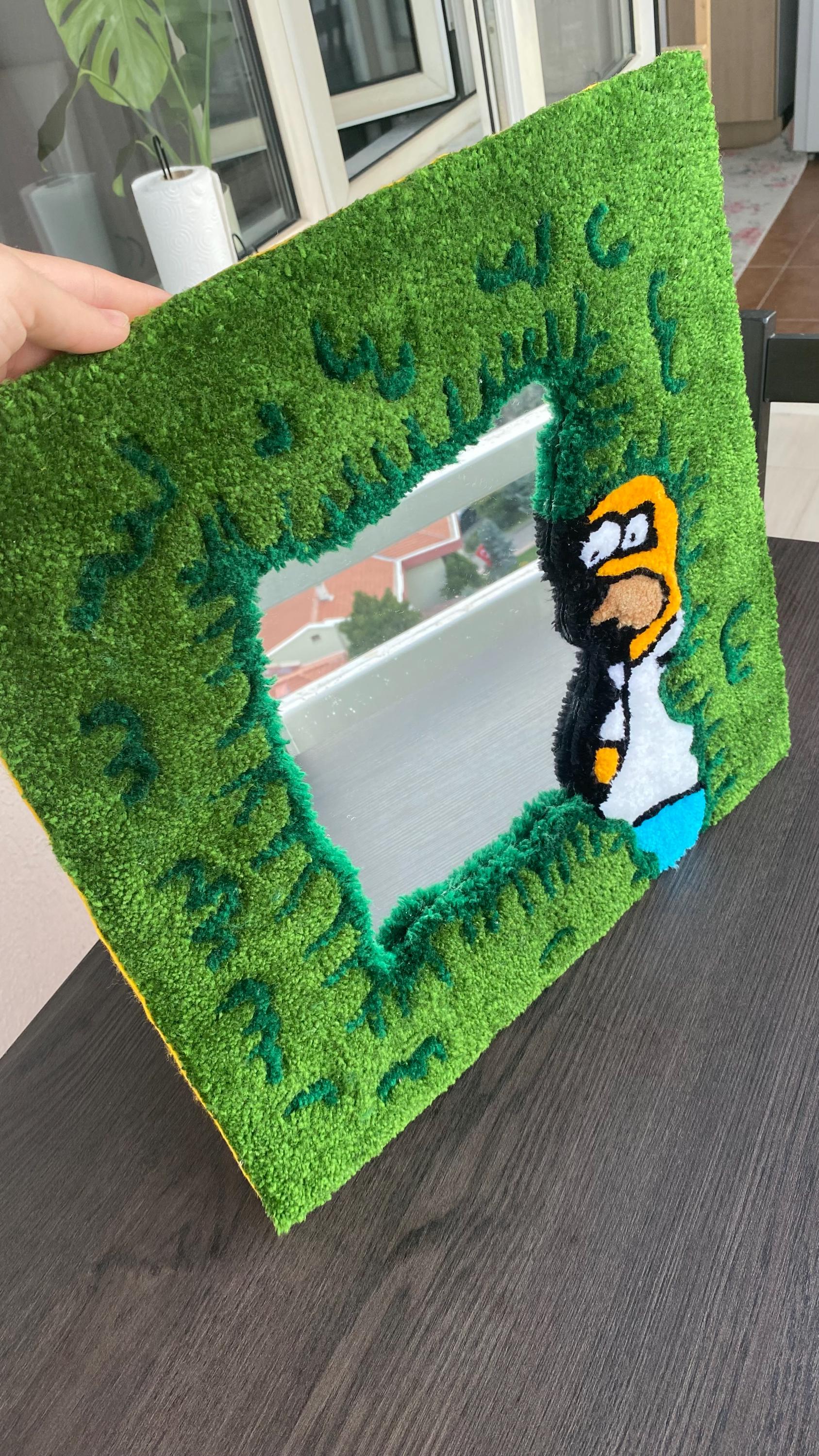 Add humor and personality to your space with this unique handmade Homer Simpson tufted mirror frame! Featuring the iconic character in vibrant greens with his signature expression, this functional art piece includes a real mirror. Perfect for Simpsons fans, pop culture lovers, and anyone who wants to make their guests smile!